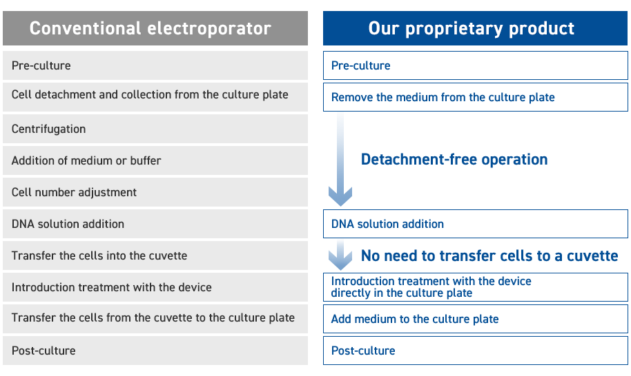 Unlike conventional electroporators, our proprietary device does not require cell detachment and enables gene introduction directly in the culture plate.